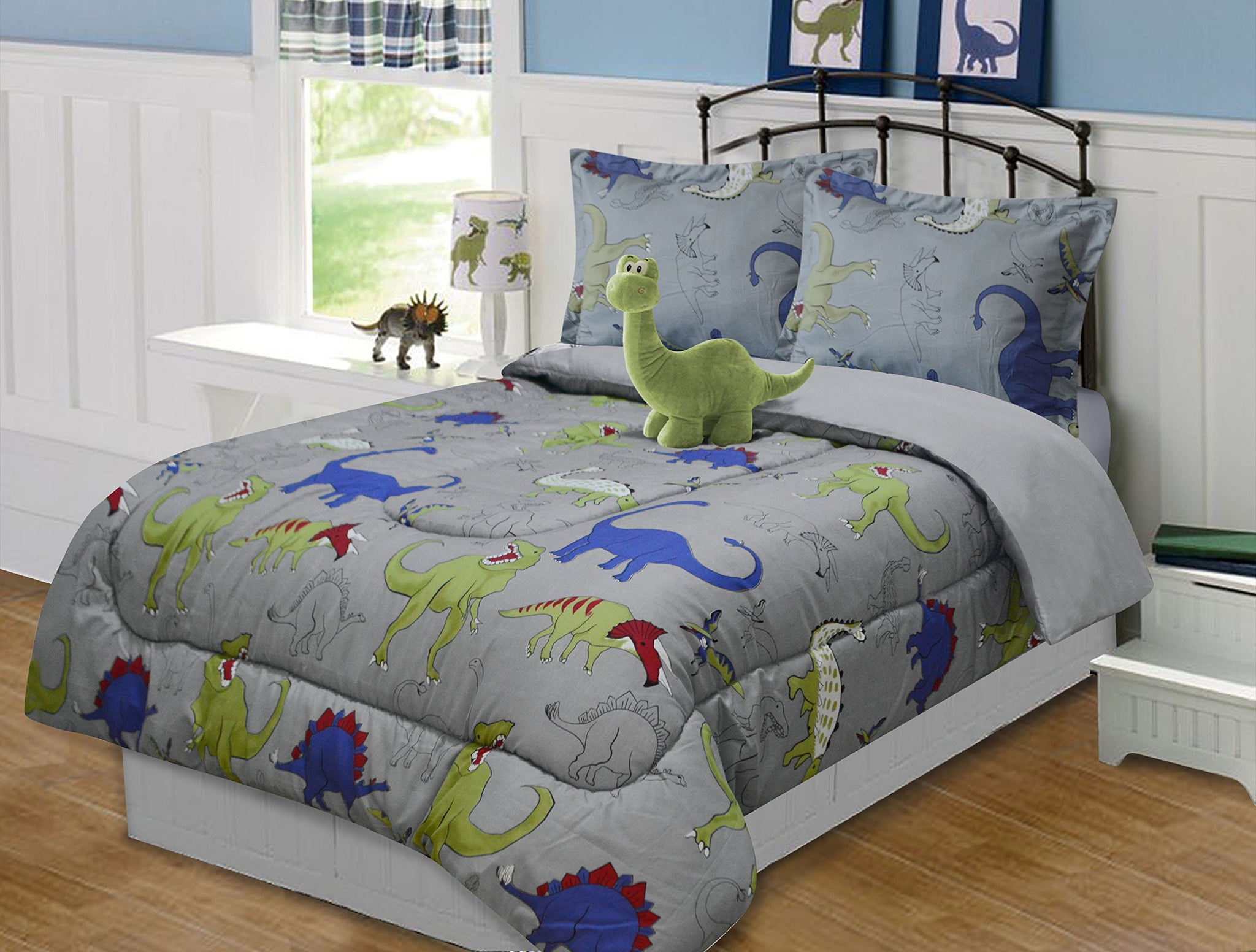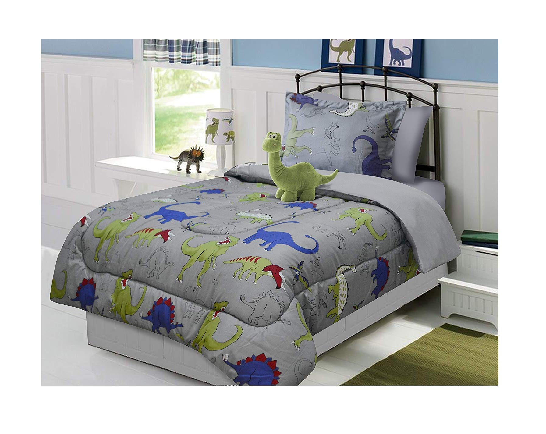 Details: Turn your child's bedroom into Dinosaur Central with this colorful comforter bed set. The comforter forms the centerpiece of the room with its design of popular dinosaurs on a gray background that blends easily into any setting. The vibrant color scheme of green, blue and red is carried through to the included pillow sham. There's also a cute stuffed animal brontosaurus that doubles as an accent cushion to complete the look. The comforter measures 64" x 86". Be sure to check out the matching curtain and sheet sets for a complete bedroom makeover that's sure to please your budding paleontologist.