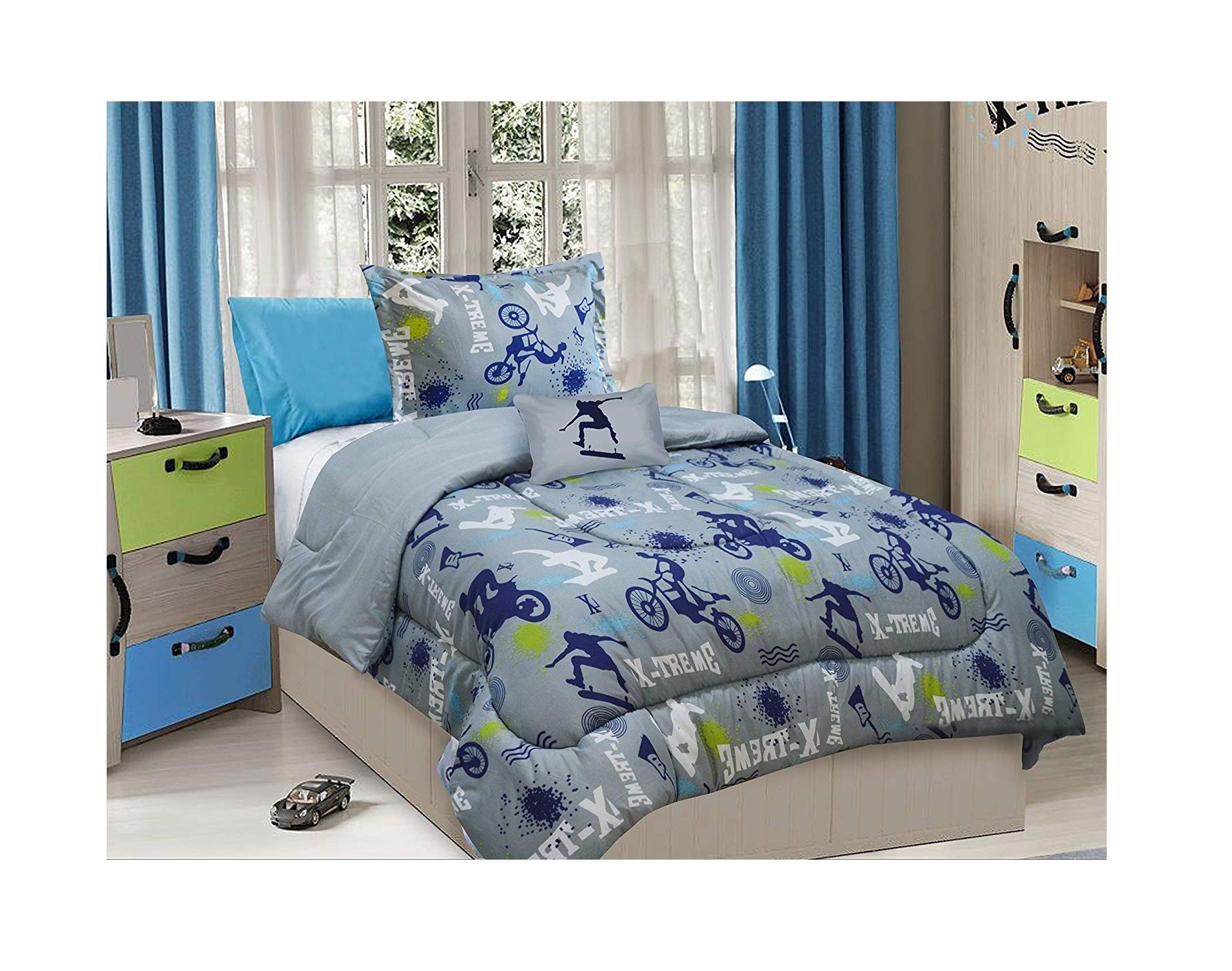 Details: The X-TremeSports comforter set is perfect for the skateboarder, mountain biker or snowboarder in your house. The silhouetted sports figures make a fun pattern on one side of the comforter, while the reverse is a soothing solid color. The twin comforter comes with one matching pillow sham for a full bed set in one easy package. Rounding out the set is an accent pillow featuring a skateboarder to complete the look. Polyester construction is durable and machine washable. Comforter measures 76" x 86" This bedding adds a punch of pizzazz to any child's or teen's bedroom.