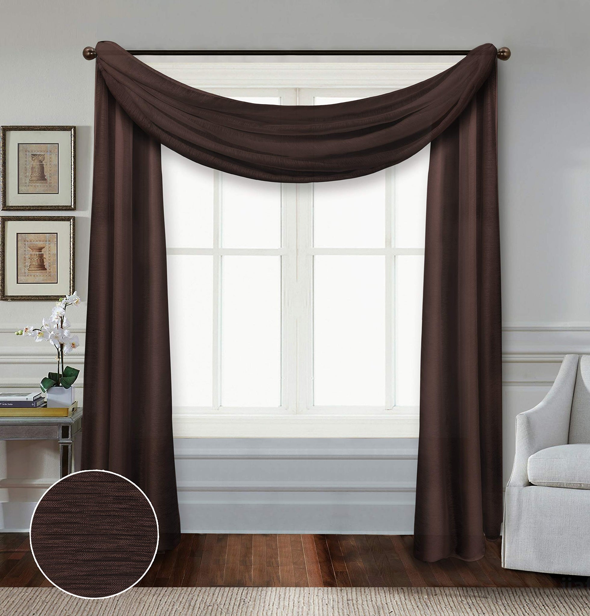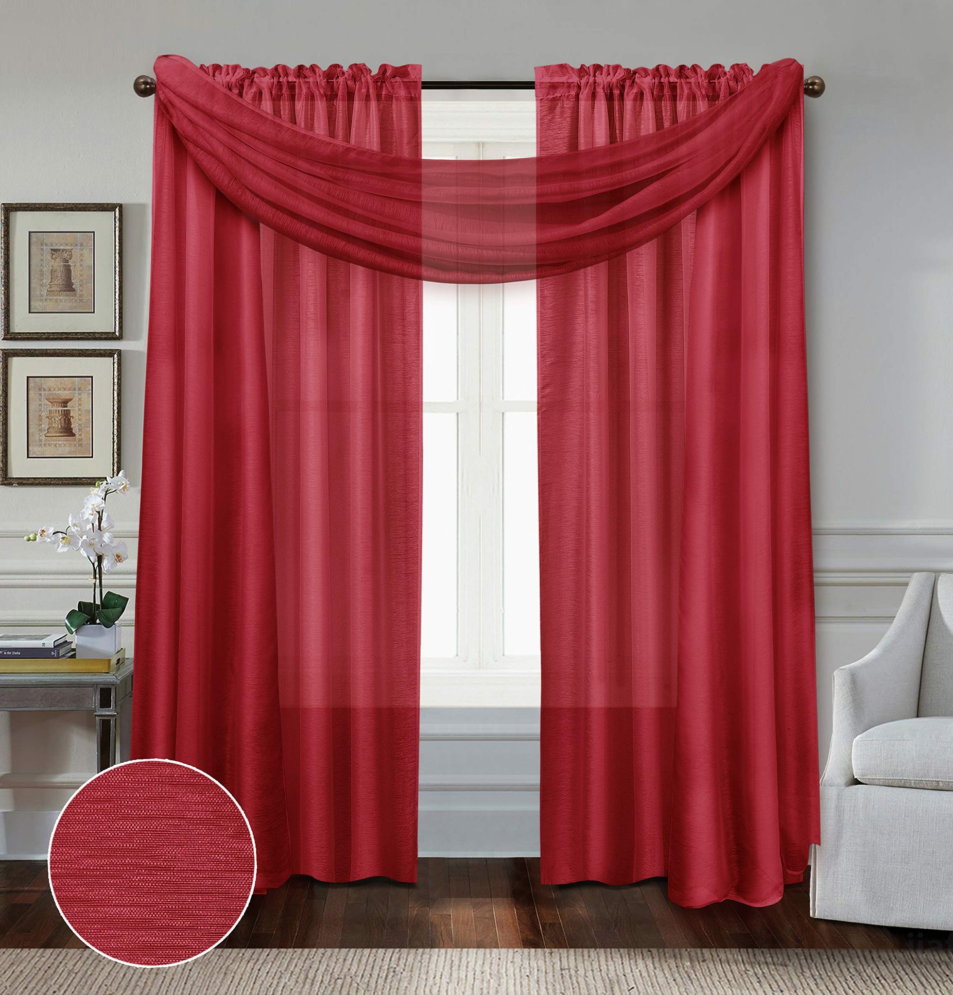 Details: Enhance your interior design with lightweight Doli sheers from the All American Collection. Each package contains two curtain panels and 1 scarf. The sheer fabric filters natural daylight through your windows while adding rich color that doesn't get washed out. The 1-inch rod pocket offers classic, carefree styling and easy installation - just hang and go!