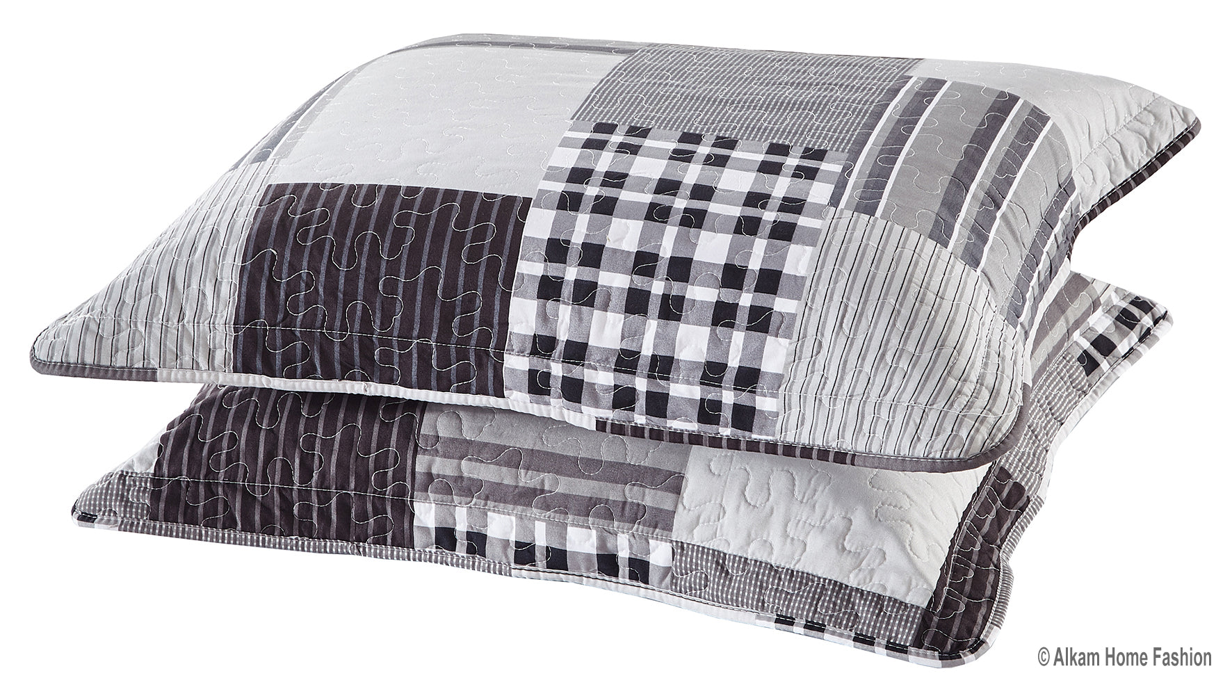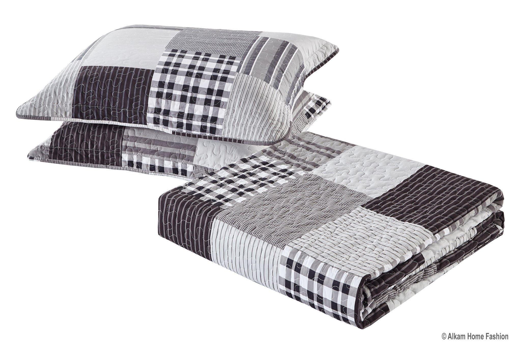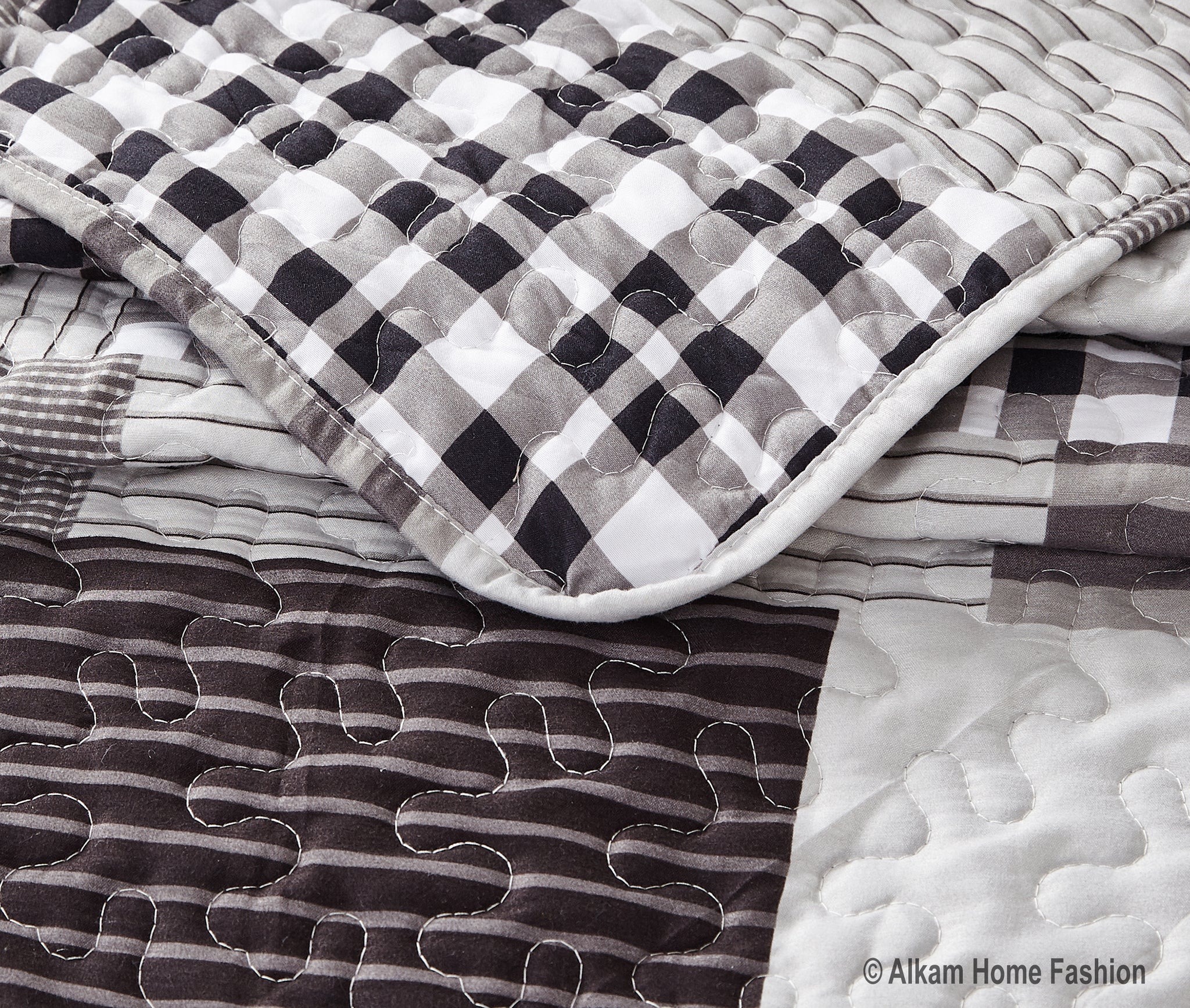 Details: This lightweight coverlet is the perfect finishing touch for your bedroom décor, no matter what the season. The pattern includes wide stripes of coordinating black plaids and ginghams interspersed with soothing dove gray. The king set includes one bedspread and two matching pillow shams to finish the look. Both the coverlet and pillow shams are made from 100% Polyester, which makes them washer and dryer safe for total ease of care. The traditional quilt stitching is perfect for transitional décor where traditional and modern elements blend into a unique style.